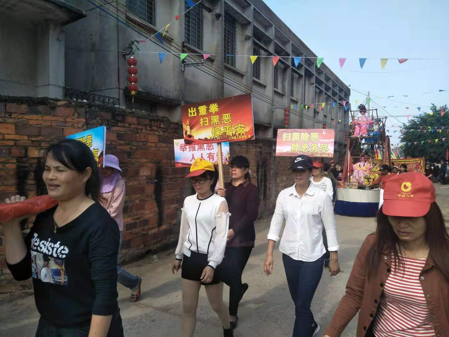镇组织宣传车进行引路,随后是群众手举扫黑除恶宣传牌,结合年例闹元宵活动同时进行游行宣传,营造“扫黑除恶全民参与”的良好氛围。