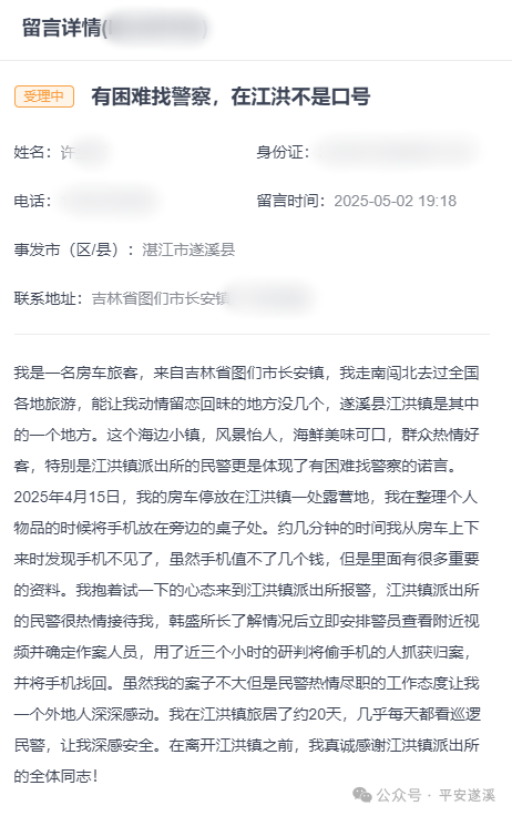 4月23日,许先生带着“有困难找警察 在江洪不是口号 热心为民 办案神速”的锦旗来到江洪派出所,称赞民警破案神速,在3个小时内找回其被盗窃的手机。5月2日,在离开之际,许先生再次在“局长信箱”写来感谢信。许先生在信中说道,“我在江洪镇旅居了约20天,几乎每天都看(到)巡逻民警,让我深感安全。”在感受安全的同时,许先生也真正感受到了有困难找警察在江洪镇并不是一句口号,江洪派出所真正做到了为人民服务的初衷。