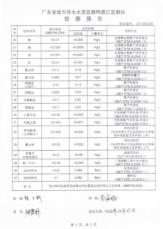 极速飞艇 粤海水务有限公司运河水厂出厂水检测报告