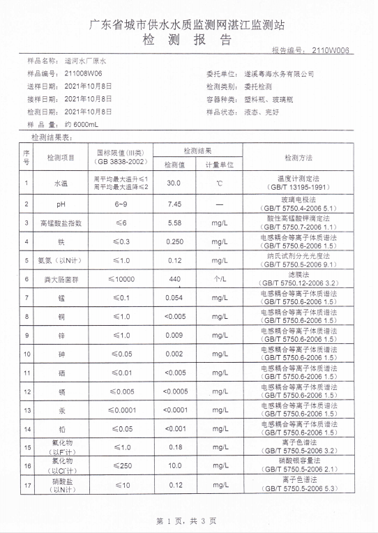 极速飞艇 粤海水务有限公司运河水厂原水检测报告