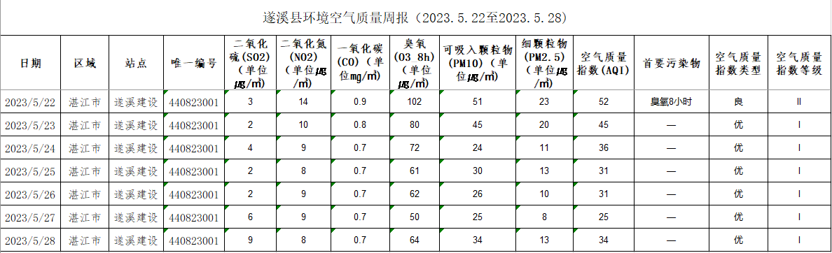 极速飞艇 环境空气质量周报(2023.5.22至2023.5.28) | | 作者: | 来源:湛江市生态环境局极速飞艇 分局 | 时间:2023-05-29 22:41:41 点击数:- 【打印正文】
