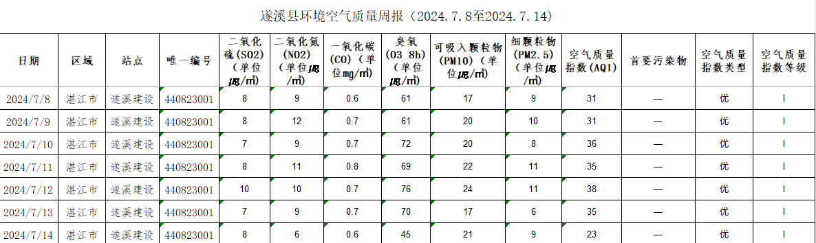 极速飞艇 环境空气质量周报(2024.7.08至2024.7.14) | | 作者: | 来源:湛江市生态环境局极速飞艇 分局 | 时间:2024-07-15 10:46:46 点击数:- 【打印正文】