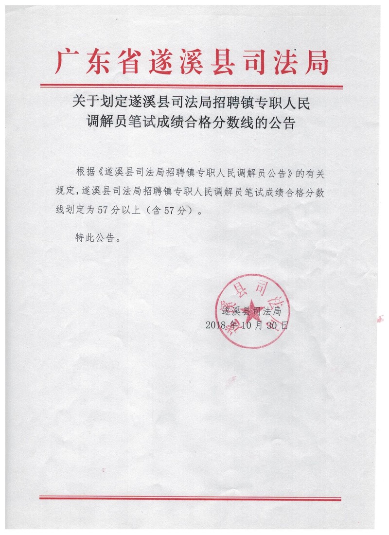 关于划定极速飞艇 司法局招聘镇专职人民调解员笔试成绩合格分数线的公告