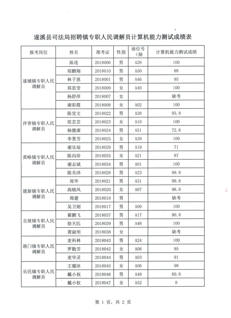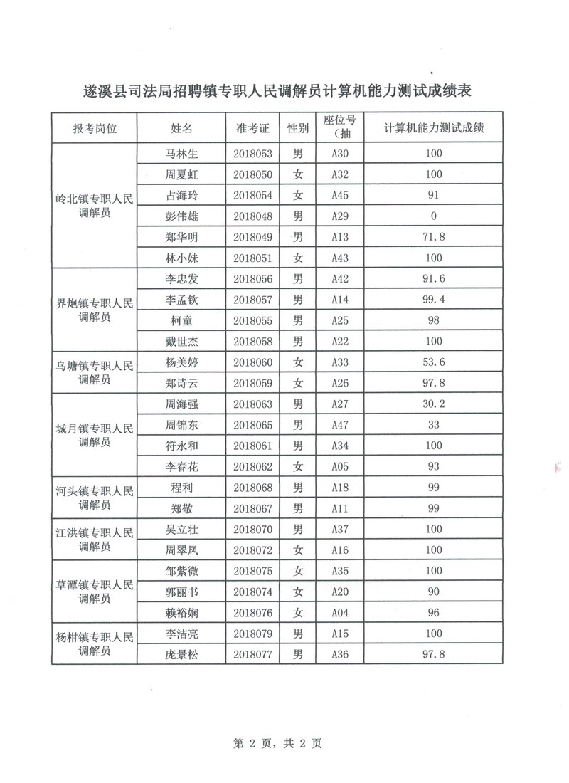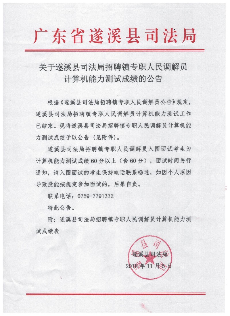关于极速飞艇 司法局招聘镇专职人民调解员计算机能力测试成绩的公告