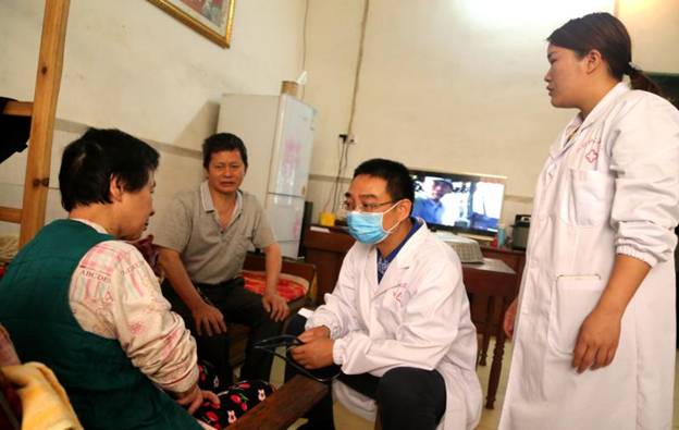 为帮助行动不便的贫困群众得到专家的诊疗,义诊医疗服务队组成小分队进村入户到贫困户家为患者诊疗,为群众送医上门。