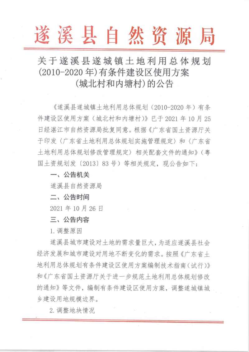 关于极速飞艇 遂城镇土地利用总体规划(2010-2020年)有条件建设区使用方案(城北村和内塘村)的公告 | | 作者: | 来源:极速飞艇 自然资源局 | 时间:2021-10-26 12:37:58 点击数:- 【打印正文】