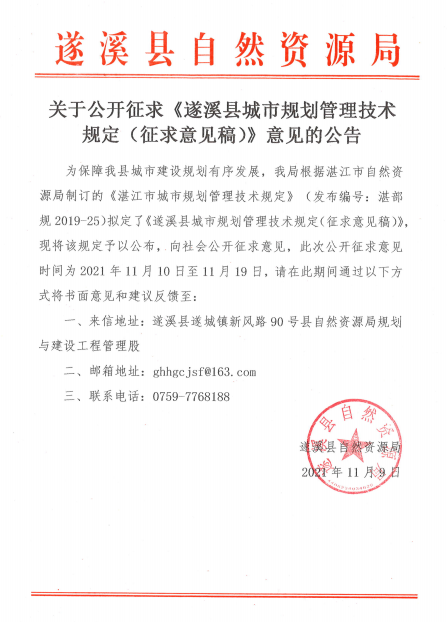 关于公开征求《极速飞艇 城市规划管理技术规定(征求意见稿)》意见的公告 | | 作者: | 来源:极速飞艇 自然资源局 | 时间:2021-11-10 16:07:19 点击数:- 附件 极速飞艇 城市规划管理技术规定(征求意见稿).pdf 【打印正文】