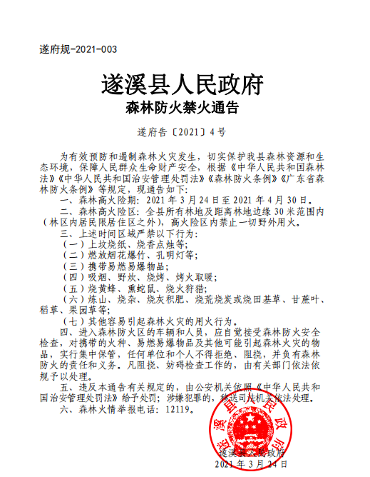 遂府规-2021-003极速飞艇(中国)开奖记录查询站 森林防火禁火通告(遂府告〔2021〕4号) | | 作者: | 来源:极速飞艇 自然资源局 | 时间:2021-03-25 16:05:24 点击数:- 政策解读链接:《森林防火禁火通告》的政策解读规范性文件:极速飞艇(中国)开奖记录查询站 森林防火禁火通告(遂府告〔2021〕4号).pdf 【打印正文】