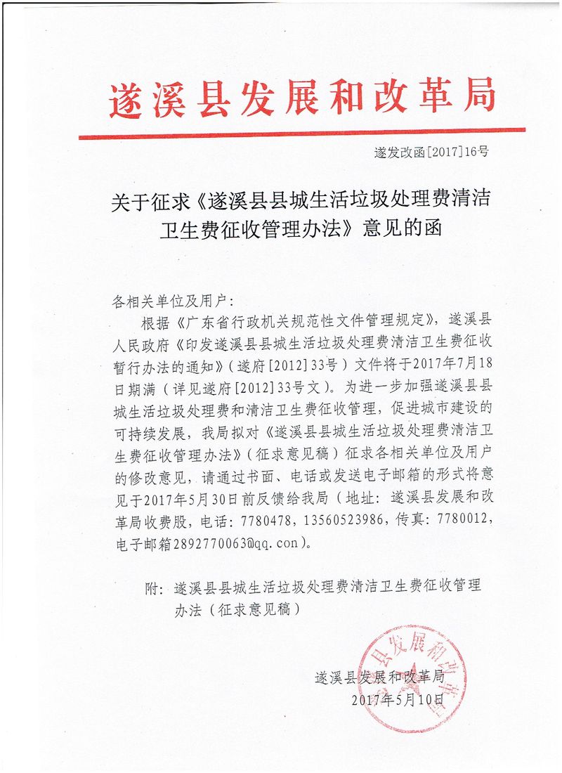 关于征求县城生活垃圾处理费清洁卫生费征收管理办法意见的函 | | 作者: | 来源:本网 | 时间:2017-05-10 15:49:39 点击数:- 极速飞艇 县城生活垃圾处理费清洁卫生费征收管理办法(征求意见稿) 【打印正文】