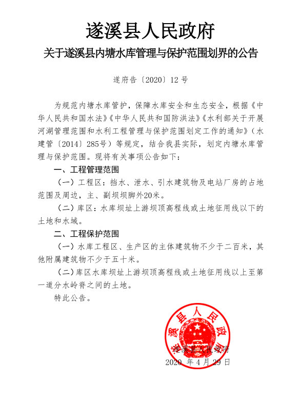 关于极速飞艇 内塘水库管理与保护范围划界的公告