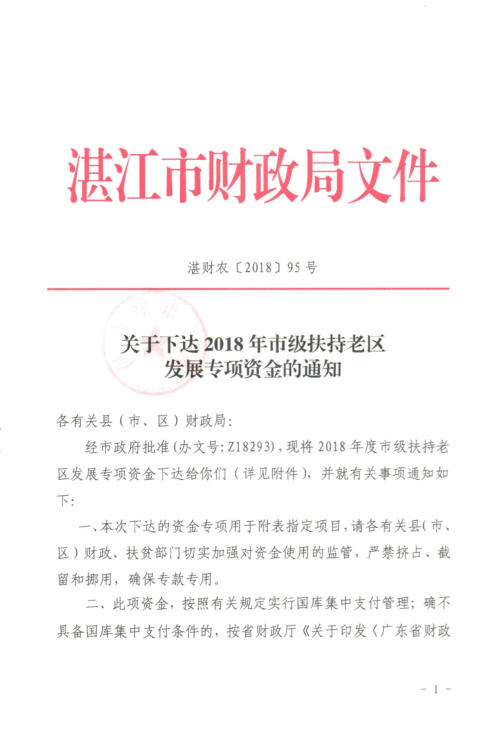 湛财农【2018】95号 关于下达2018年市级扶持老区发展专项资金的通知